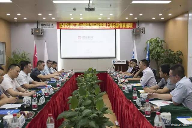 8月6日江西中聯(lián)建設(shè)集團(tuán)有限公司董事長(zhǎng)李海文、副董事長(zhǎng)李志文、江西中耀建設(shè)有限公司總經(jīng)理李志強(qiáng)等一行蒞臨建業(yè)科技上??偛靠疾旖涣?,宏盛建業(yè)投資集團(tuán)、上海建業(yè)信息科技股份有限公司(以下簡(jiǎn)稱:建業(yè)科技,股票代碼:838581)董事長(zhǎng)周金虎、集團(tuán)公司首席顧問(wèn)黃如福、建業(yè)科技研發(fā)總監(jiān)張成龍生、營(yíng)銷(xiāo)總監(jiān)杜林等主要負(fù)責(zé)人陪同接待。